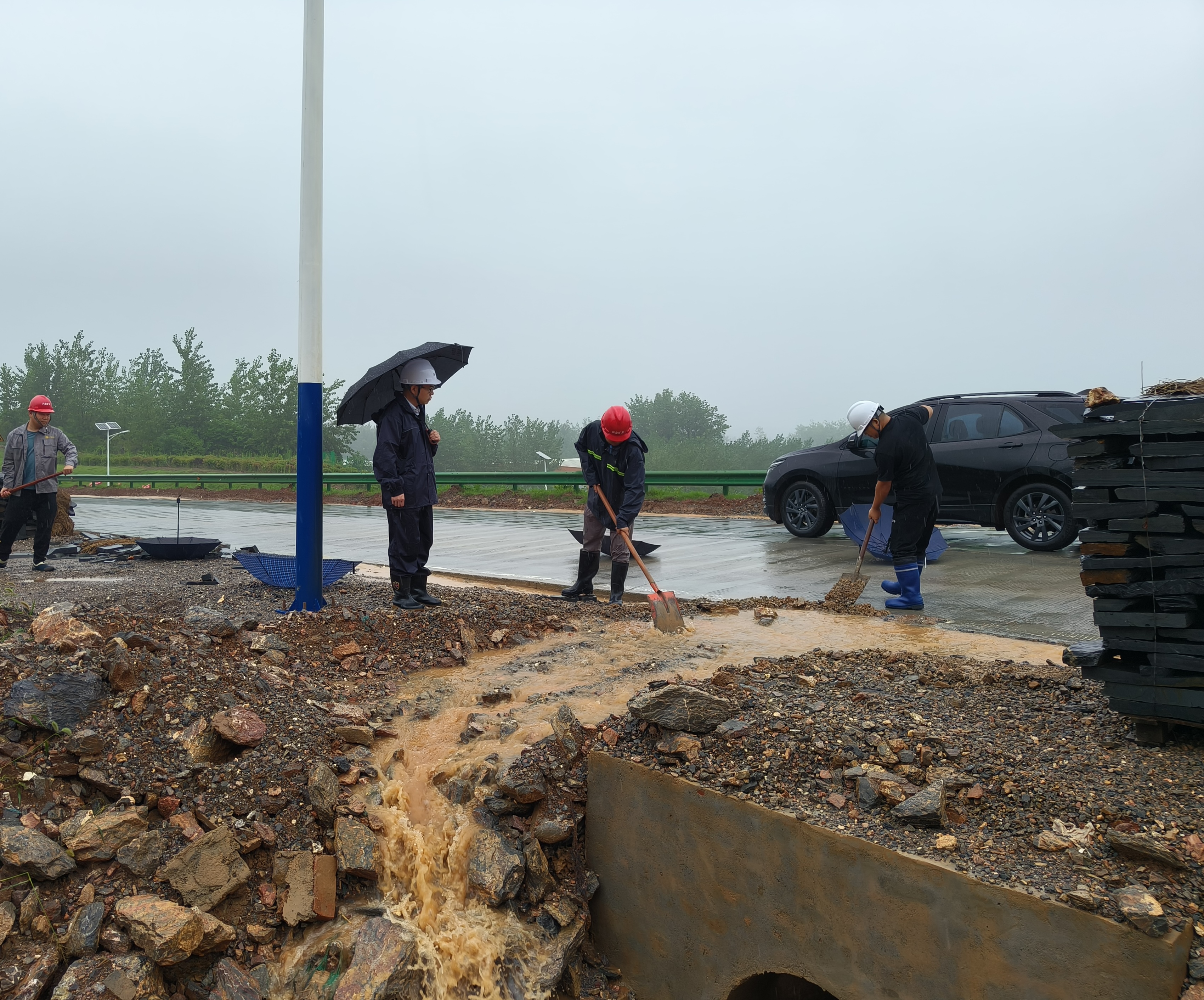 搶險(xiǎn)現(xiàn)場,黨員干部帶頭,通過沙包筑堤、開挖排水溝等措施進(jìn)行預(yù)防,同時對礦區(qū)、加工區(qū)開展全面隱患排查。中午,水塘漫堤隱患消除。