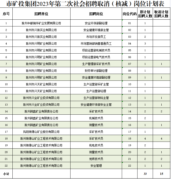 根據(jù)《滁州市興滁礦業(yè)投資集團(tuán)有限公司2023年第二次社會(huì)招聘公告》規(guī)定,經(jīng)對(duì)各崗位報(bào)名情況篩查審定,結(jié)合資格復(fù)審情況,部分崗位報(bào)名情況未達(dá)到開(kāi)考比例,經(jīng)研究決定取消以下崗位招聘計(jì)劃: