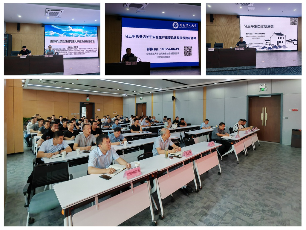 培訓(xùn)邀請(qǐng)了安徽理工大學(xué)公共安全與應(yīng)急管理學(xué)院副院長彭偉、安全科學(xué)與工程學(xué)院研究生與實(shí)驗(yàn)室中心主任李重情進(jìn)行授課,課程包含習(xí)近平總書記關(guān)于安全生產(chǎn)重要論述、習(xí)近平生態(tài)文明思想、礦山行業(yè)有關(guān)安全生產(chǎn)法律法規(guī)、《金屬非金屬礦山重大事故隱患判定標(biāo)準(zhǔn)》等內(nèi)容。